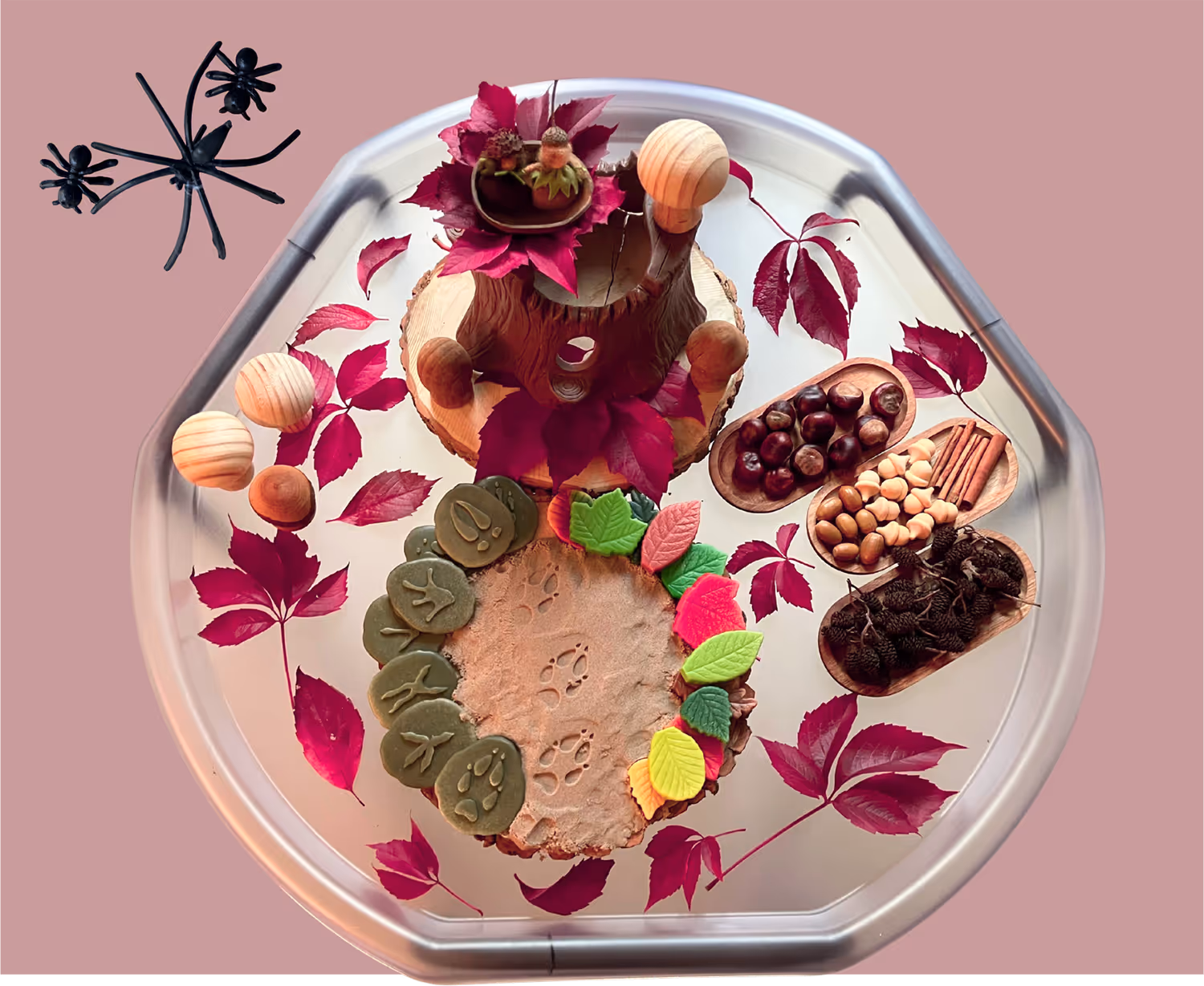 Speelstation: Tuff-tray met magnetisch zand. Sensorische stenen met met pootafdrukken, blaadjes met voelbare nerven om afdrukken mee te maken.
