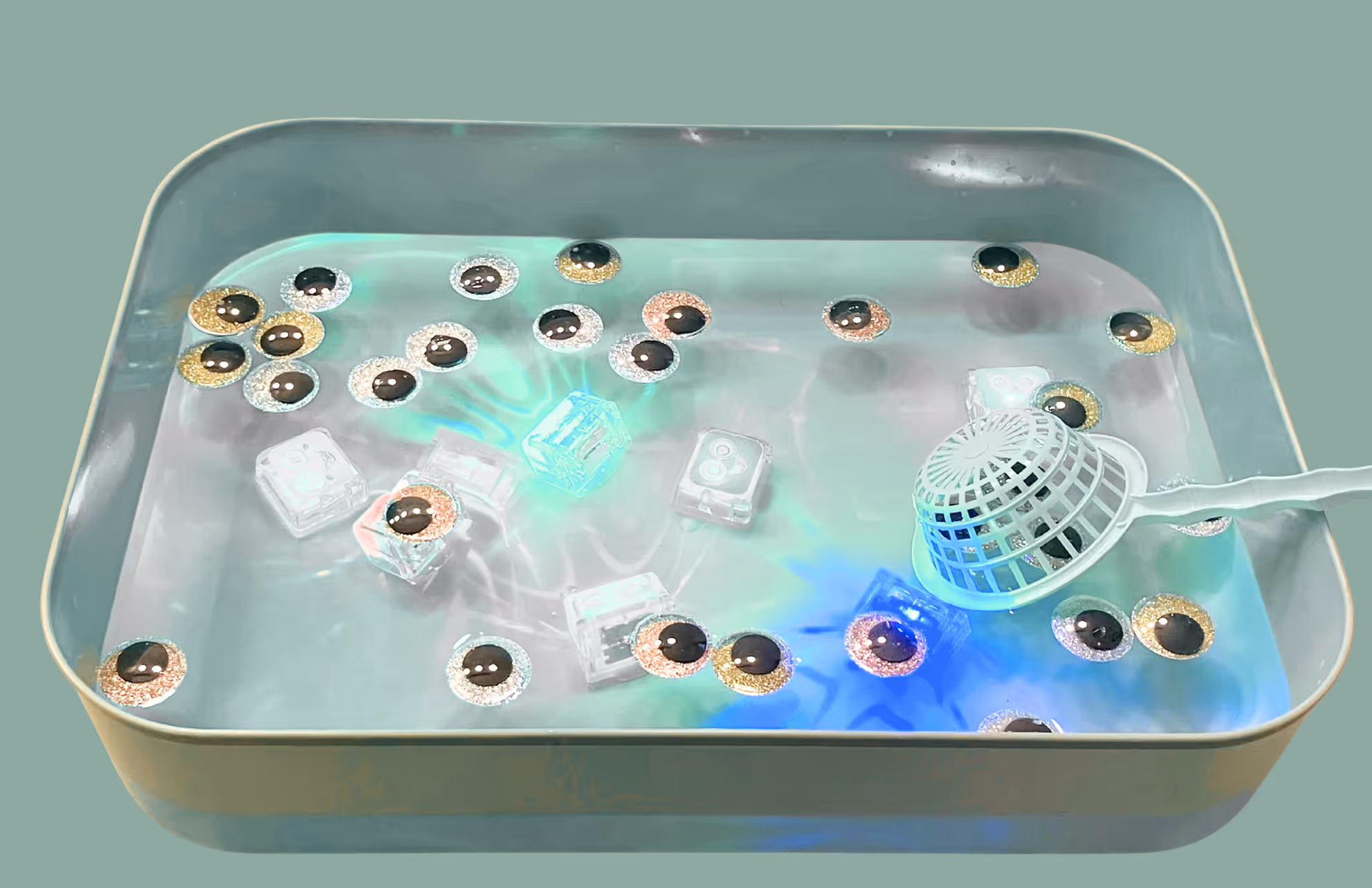 Speelstation: Waterbak met oogjes en Glo Pals, lichtgevende blokjes.